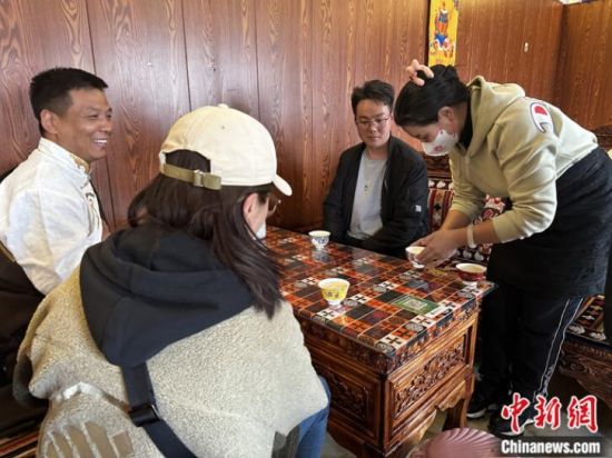 資料圖為長(zhǎng)江源村的一家藏餐吧迎來客人。 中新社記者 李雋 攝