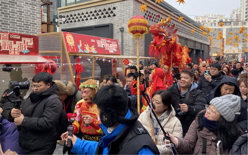當(dāng)日舉行的巡游活動(dòng)將氣氛推向高潮。由雪餅猴、舞龍舞獅、糖葫蘆NPC、二次元、瘋狂動(dòng)物城等角色組成的多元方陣,沿著主街歡樂行進(jìn)。