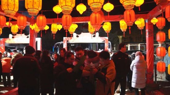 夜幕初臨的長白山文化博覽城,早已被濃濃的節(jié)日氛圍包裹。成排的紅燈籠高高掛起,趣味燈謎懸于半空,構成一道亮麗的風景。市民和游客踴躍參與互動競猜,或低頭凝神思索,或與家人朋友輕聲討論,沉浸式體驗傳統民俗的樂趣。