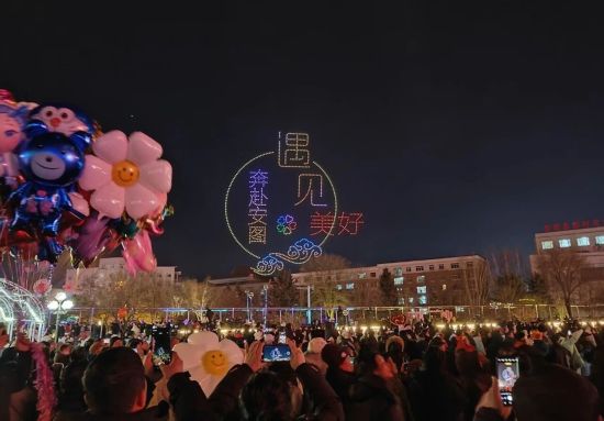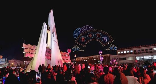 隨后,萬眾期待的無人機表演正式亮相,千余架無人機在夜空中緩緩升空,隨著音樂節(jié)奏不斷變換造型,“元宵”“飛馳的駿馬”“翱翔天空的巨龍”等圖案,“喜樂元宵”“遇見美好奔赴安圖”等字樣在夜空中次第呈現,勾勒出唯美浪漫的立體畫面,引得現場觀眾紛紛舉起手機,記錄下這一震撼而美好的瞬間。