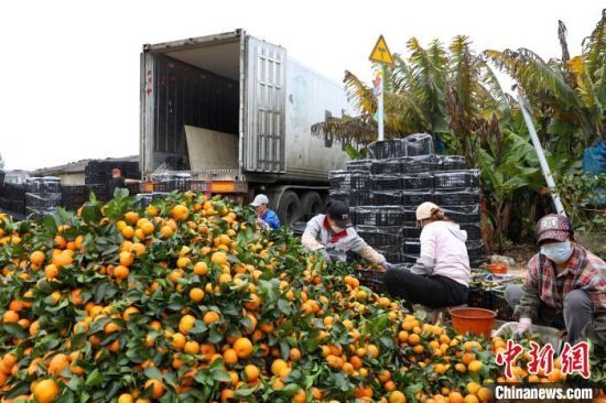 1月5日,在廣西南寧市西鄉(xiāng)塘區(qū)壇洛鎮(zhèn)同富村,村民分揀剛采摘的砂糖橘。眼下正是砂糖橘成熟的季節(jié),當(dāng)?shù)剞r(nóng)民忙著采摘上市。(資料圖) 中新社記者 王偉臣 攝