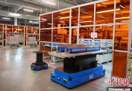 AGV配送車在運(yùn)送電芯。張瑤 攝