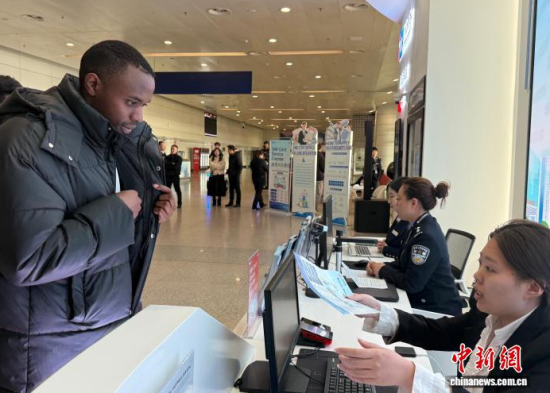 1月20日,吉林長(zhǎng)春,外國(guó)留學(xué)生在長(zhǎng)春龍嘉國(guó)際機(jī)場(chǎng)“吉便利”出入境一站式綜合服務(wù)窗口辦理相關(guān)業(yè)務(wù)!≈行律缬浾 張瑤 攝