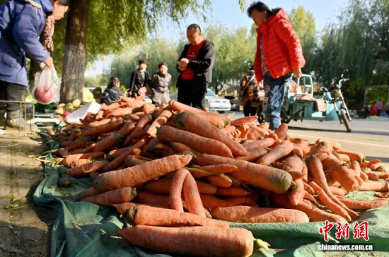10月16日,吉林長(zhǎng)春,市民在挑選胡蘿卜。當(dāng)下正是中國(guó)東北民眾“囤秋菜”的季節(jié),滿載大蔥、白菜、胡蘿卜等秋菜的貨車?吭陂L(zhǎng)春市區(qū)指定銷售區(qū)域,市民們穿梭挑選,忙碌地儲(chǔ)備過冬秋菜。中新社記者 張瑤 攝