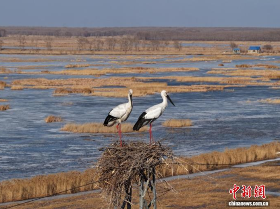 3月16日,吉林鎮(zhèn)賚,一對(duì)東方白鸛在莫莫格濕地的巢中休憩!∨岁申 攝