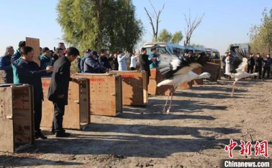 中新網(wǎng)長春11月19日電 (張瑤 王萬峰)吉林省林業(yè)和草原局19日介紹,該局近日組織野生動物救護(hù)部門將救助的11只東方白鸛成功護(hù)送到天津七里海國家濕地公園與已遷徙至那里的種群匯合。這是吉林省第一次大規(guī)?缡∽o(hù)送“鳥界國寶”東方白鸛歸隊(duì)。