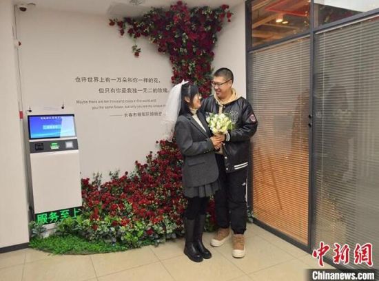 2月1日,在長春市朝陽區(qū)婚姻登記處,多對新人在辦理結(jié)婚登記。該婚姻登記處近日打造了三種不同風(fēng)格的拍攝場景,并為新人準(zhǔn)備了鮮花、婚紗以及特色服裝等,給前來登記結(jié)婚的新人一個大大的驚喜。