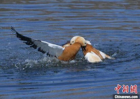 兩只赤麻鴨在水中嬉戲。