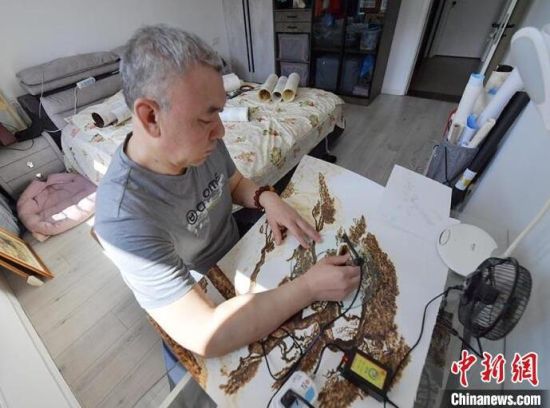 4月3日,吉林長(zhǎng)春,56歲的長(zhǎng)春市民王巖在工作室進(jìn)行烙畫(huà)創(chuàng)作。自幼熱愛(ài)繪畫(huà)的王巖,在機(jī)緣巧合下接觸到烙畫(huà)技藝,從此便悉心鉆研。烙畫(huà)又稱(chēng)火筆畫(huà),是指用火燒烙鐵在物體上熨出烙痕作畫(huà)的一項(xiàng)技藝。