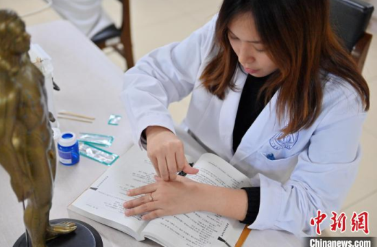 10月23日,吉林長春,林玉花在練習(xí)針灸。來自泰國的林玉花是長春中醫(yī)藥大學(xué)中醫(yī)內(nèi)科學(xué)的研究生,經(jīng)過一年多的深造,她越發(fā)愛上博大精深的中醫(yī)和中國傳統(tǒng)文化。林玉花說,她希望把在中國學(xué)到的中醫(yī)技藝帶回家,將來開一家中醫(yī)館。中新社記者 張瑤 攝