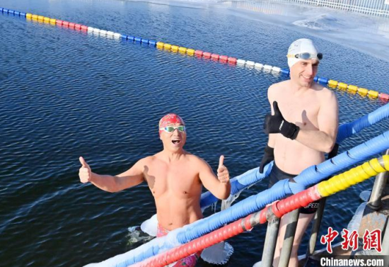 2025年1月1日,在長春南湖公園,冬泳愛好者破冰在湖水中暢游。當(dāng)天,中外百余名冬泳愛好者齊聚南湖,以冬泳的方式迎接新年。中新社記者 張瑤 攝