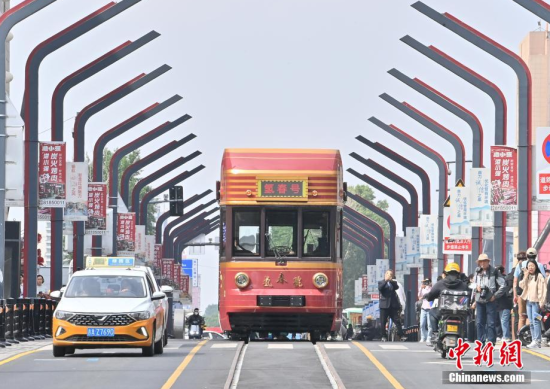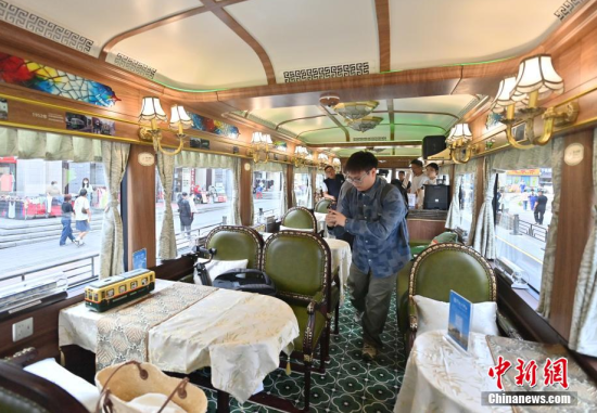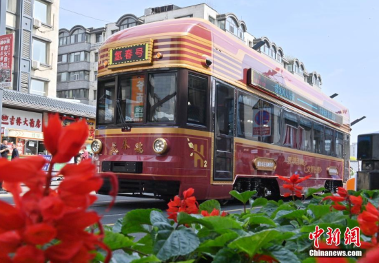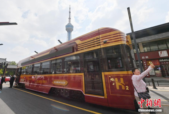 6月4日,吉林長春,市民在氫能源文旅專列旁拍照。該專列由中車長客研制,以歷史文化街區(qū)新民大街建筑群為設(shè)計靈感,車內(nèi)君子蘭花海主題內(nèi)飾與復(fù)古留聲機相映成趣。列車采用三級安全防護氫能系統(tǒng),單次加氫續(xù)航320公里。中新社記者 張瑤 攝