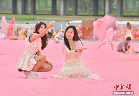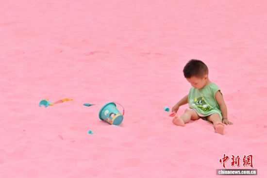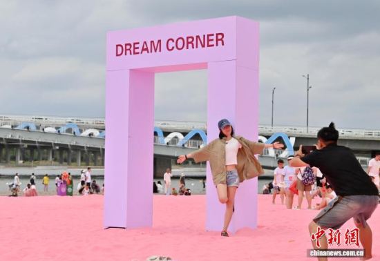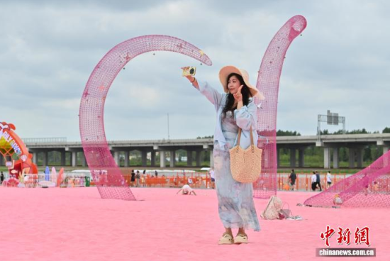 7月24日,長春市一處人工打造的粉沙灘吸引眾多游客前來打卡。這片沙灘呈現(xiàn)出夢幻的粉色,搭配周邊綠植和休閑設施,營造出浪漫氛圍。中新社記者 張瑤 攝