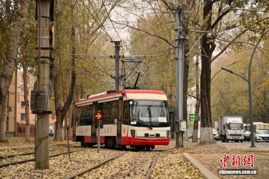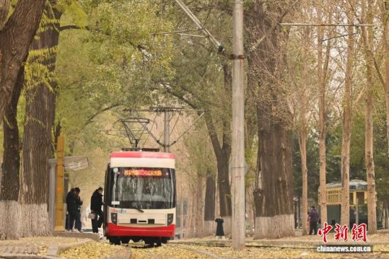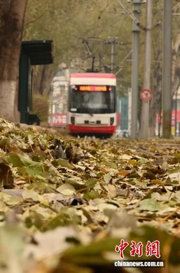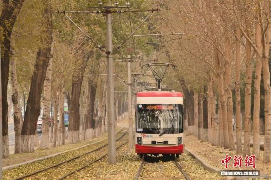 11月5日,吉林長(zhǎng)春秋意正濃,一處軌道兩旁的樹(shù)葉泛黃,有軌電車(chē)宛如在畫(huà)中穿行。中新社記者 張瑤 攝