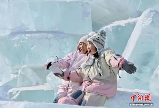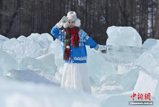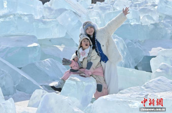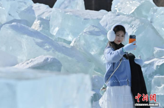 2月9日,在長春凈月潭國家森林公園內(nèi),由水庫天然冰塊堆砌而成的“藍(lán)冰”景觀,吸引市民打卡拍照。“藍(lán)冰”是指致密堅(jiān)硬的冰,因冰內(nèi)部空氣被擠掉而變得晶瑩透徹,這時(shí)陽光中波長較短的藍(lán)光被致密堅(jiān)厚的冰層散射,冰塊便呈現(xiàn)出水晶般美麗的藍(lán)色。中新社記者 張瑤 攝