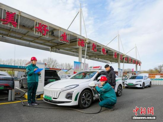 電力員工服務(wù)新能源汽車(chē)車(chē)主充電。(國(guó)網(wǎng)吉林省電力有限公司供圖)